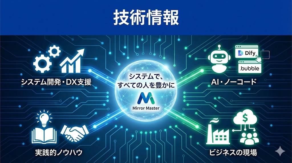 「システムで、すべての人を豊かに」という理念のもと、代表が40年にわたるキャリアで培ってきたシステム開発、DX支援、AI、ノーコードに関する実践的な技術情報やノウハウを発信します。『簡単相続ナビ』の開発思想から、DifyやBubbleを活用した業務改善、WordPressサイトの構築術まで、机上の空論ではない、ビジネスの現場で本当に役立つ知見を共有し、皆様の課題解決をサポートします 。