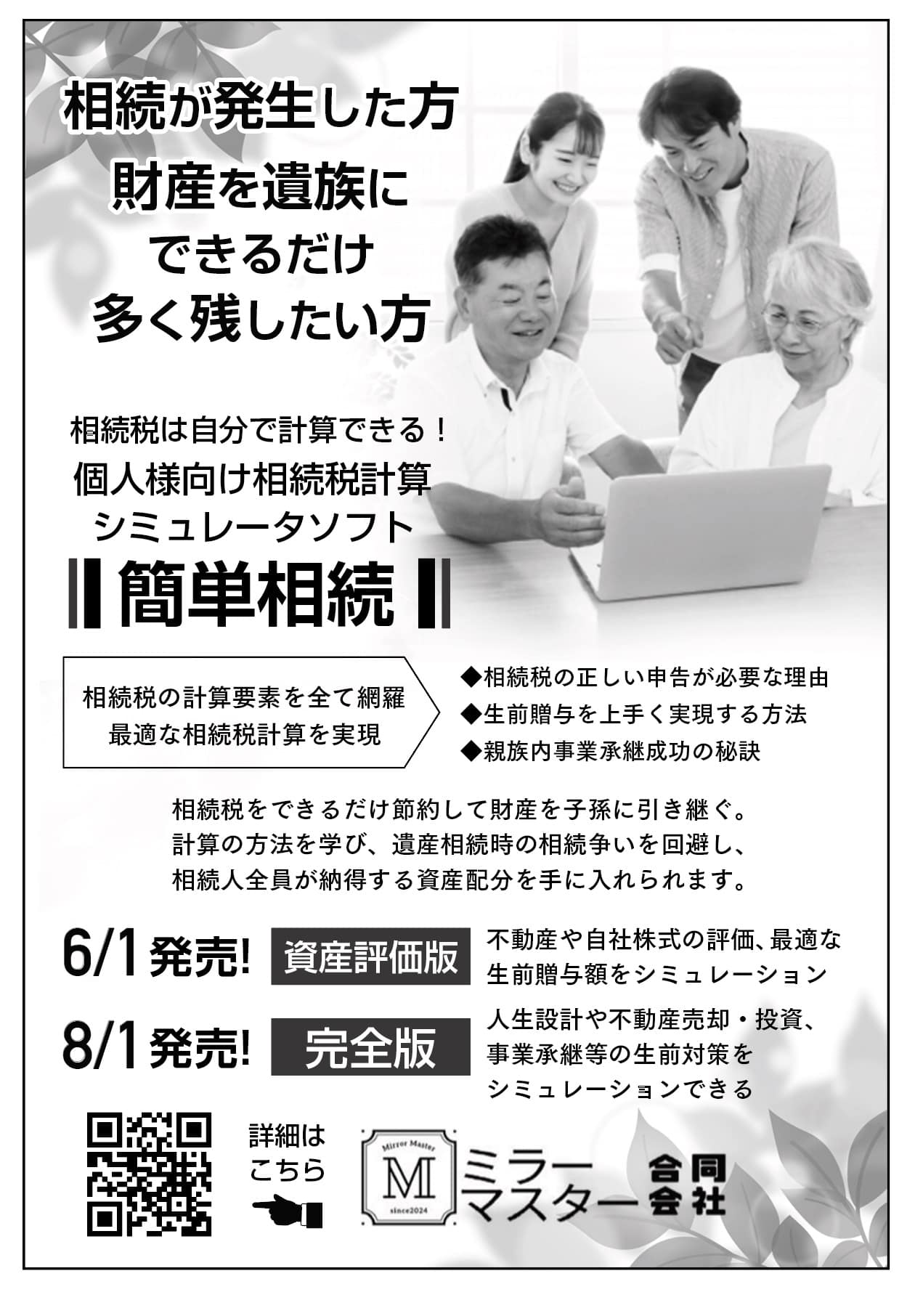 2024年5月22日、弊社が開発した**相続税計算ソフト『簡単相続』**の広告が、スポーツニッポン(通称:スポニチ)の朝刊(西部本社版)に掲載されましたことをご報告いたします。